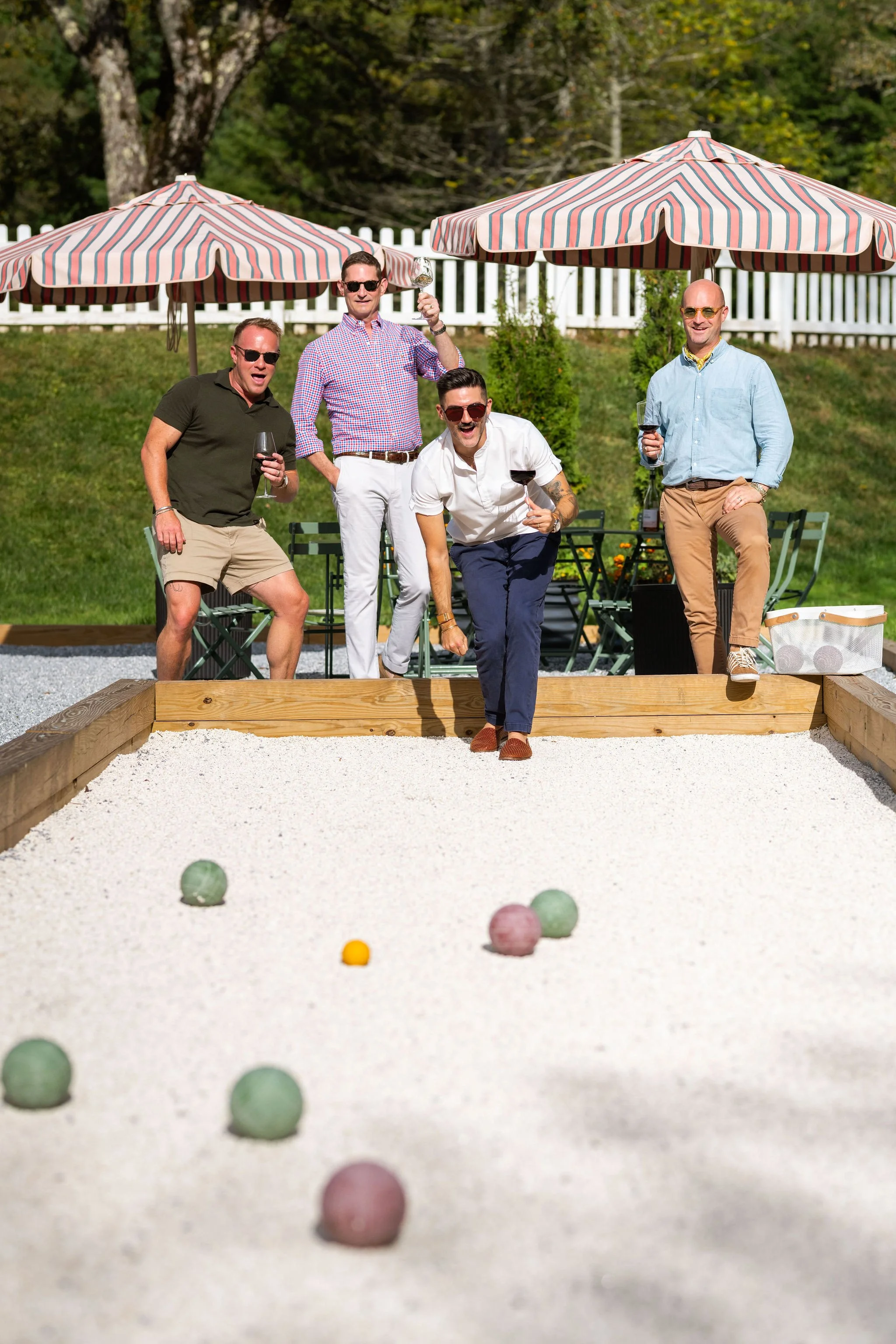 The courts are groomed. The summer sun is shining. Umbrellas are up! The vino is cold + crisp. Whether your game is light + fun or the competition is fierce … bocce is our kind of sport: wine in one hand + nibbles on the table.